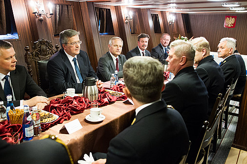 Pierwszym punktem wizyty prezydenta w Gdyni było spotkanie z ministrem obrony narodowej Tomaszem Siemoniakiem, szefem Sztabu Generalnego WP gen. Mieczysławem Cieniuchem, szefem Biura Bezpieczeństwa Narodowego Stanisławem Koziejem oraz dowódcą Marynarki Wojennej Tomaszem Matheą. Kilkunastominutowa rozmowa odbyła się na pokładzie historycznego niszczyciela ORP Błyskawica.