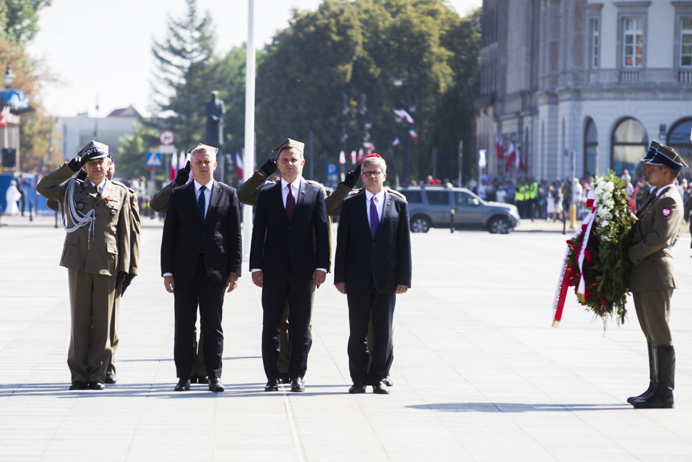 Prezydent Andrzej Duda złożył w sobotę - w Święto Wojska Polskiego - kwiaty przed pomnikiem marszałka Józefa Piłsudskiego koło Belwederu. To pierwszy punkt sobotnich obchodów wojskowego święta.Prezydentowi towarzyszyli: szef Biura Bezpieczeństwa Narodowego Paweł Soloch,wicepremier, szef MON Tomasz Siemoniak oraz najważniejsi generałowie Wojska Polskiego.