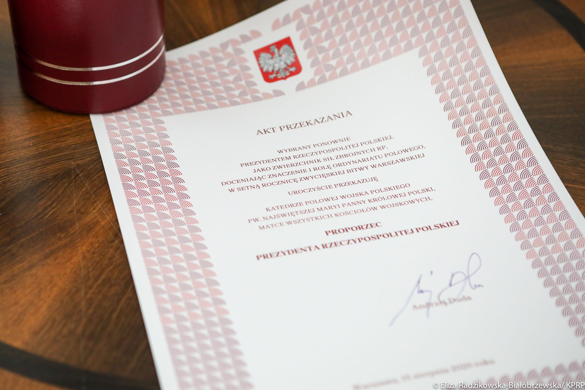 Andrzej Duda, doceniając znaczenie i rolę Ordynariatu Polowego, w setną rocznicę zwycięskiej Bitwy Warszawskiej przekazał Katedrze Polowej proporzec Prezydenta RP.