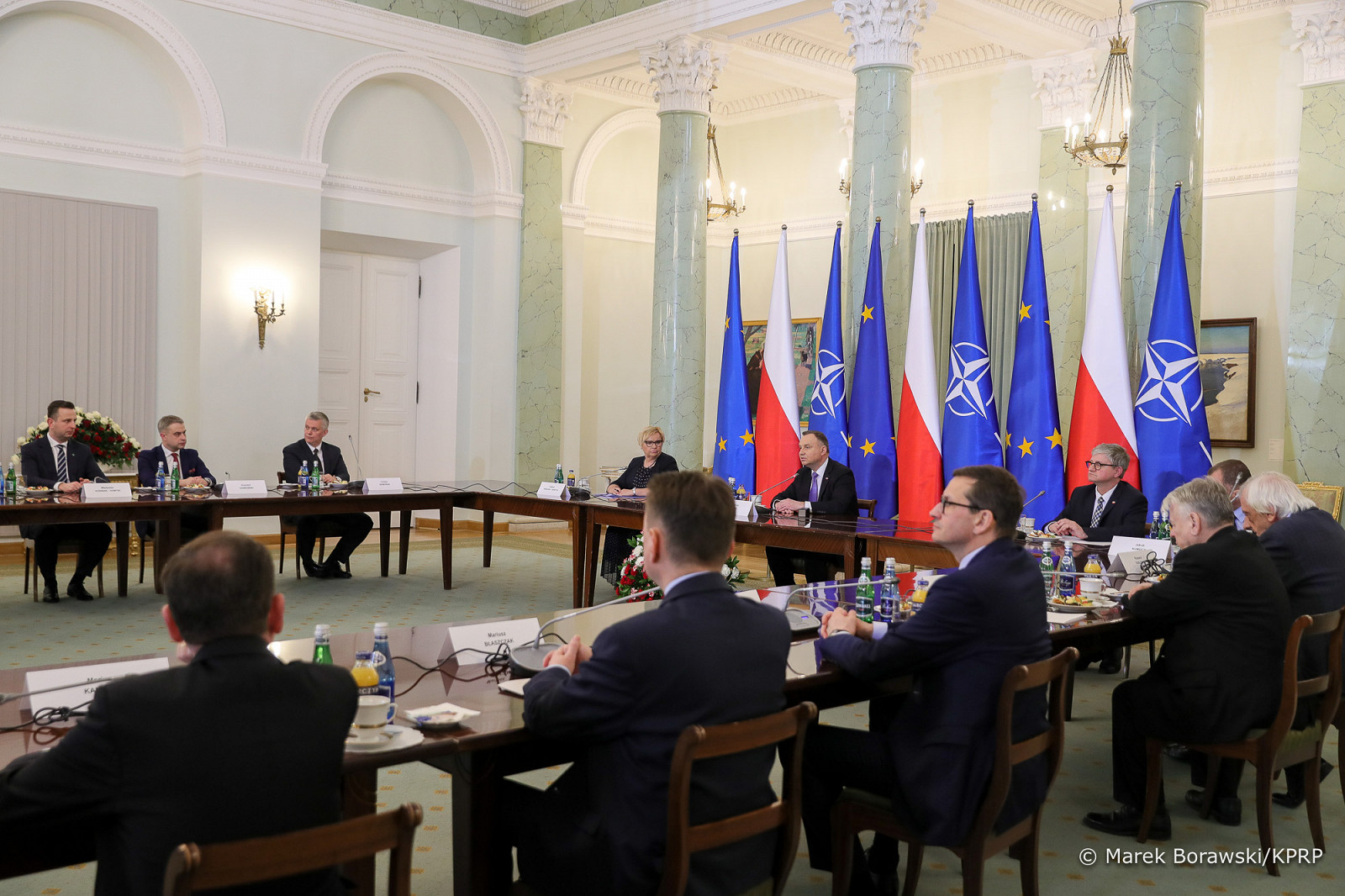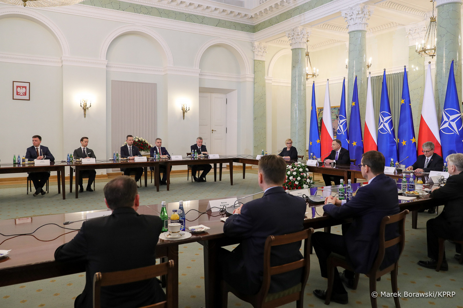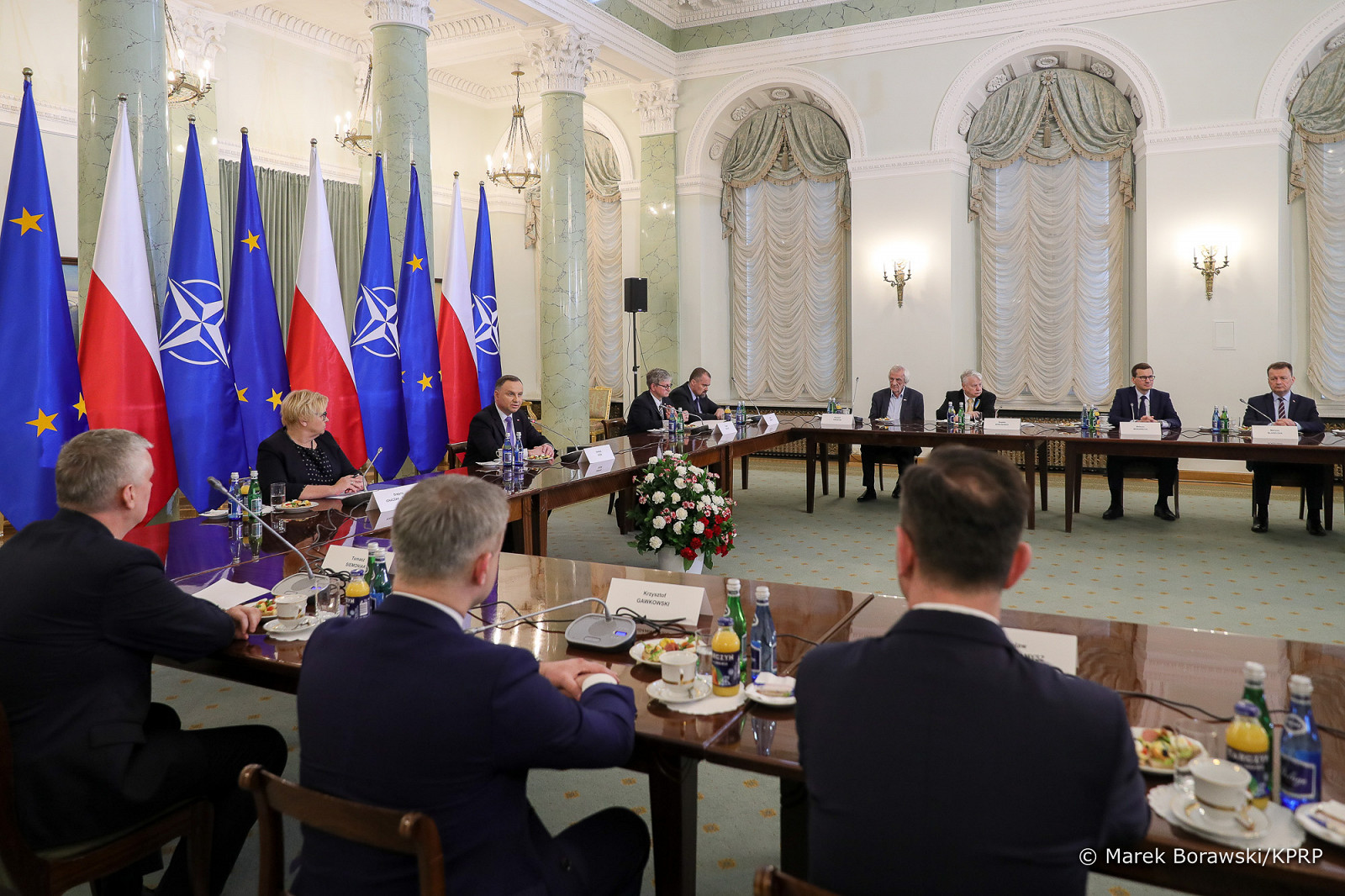 – Dziękuję za stawiennictwo. Warto, żebyśmy podzielili się informacjami, żeby była pełna świadomość, jak w danym momencie wygląda obraz sytuacji, obraz sceny politycznej, nie tylko tej naszej, wewnątrzkrajowej, ale także tej międzynarodowej – mówił Prezydent RP, otwierając posiedzenie.