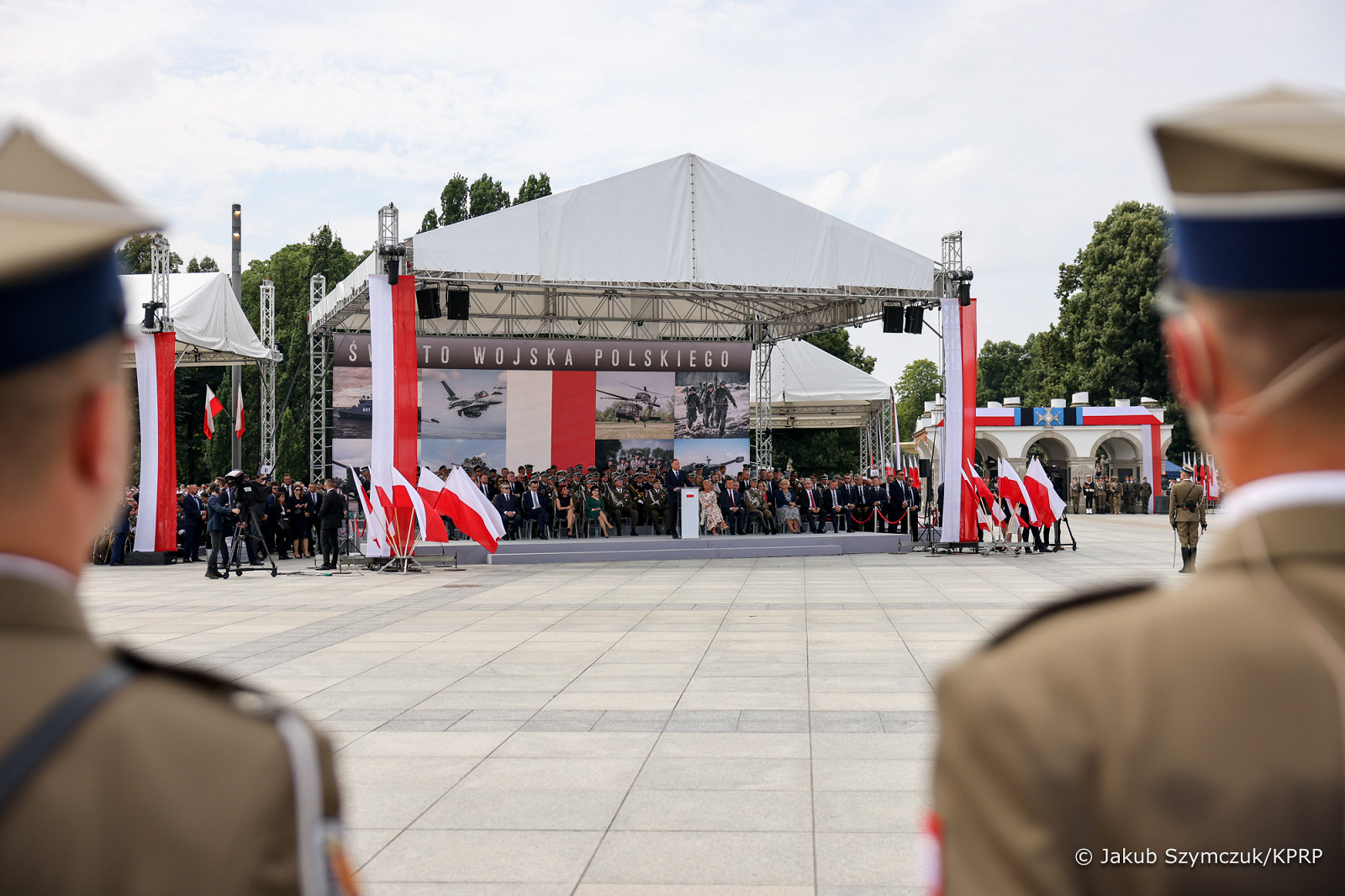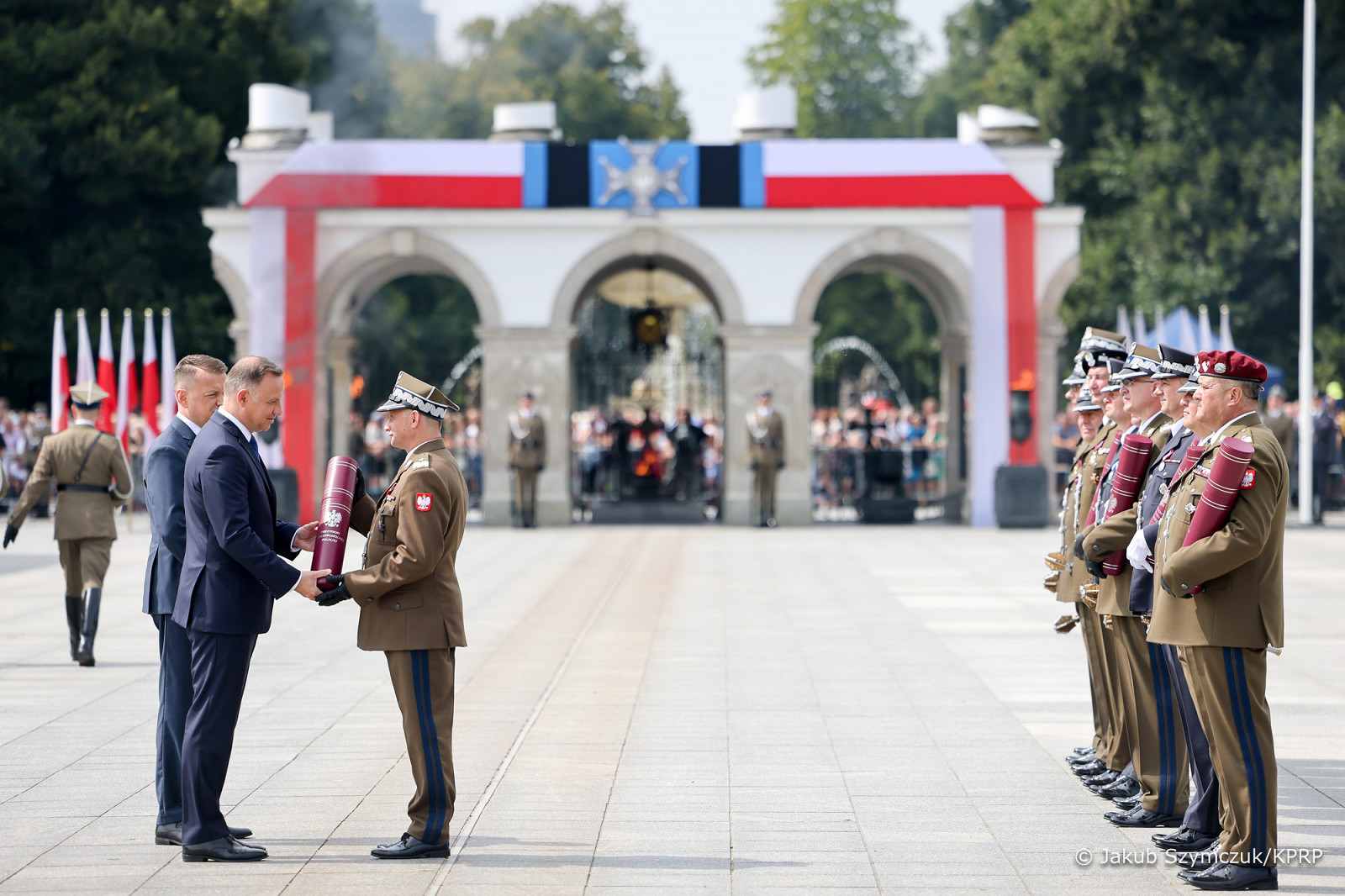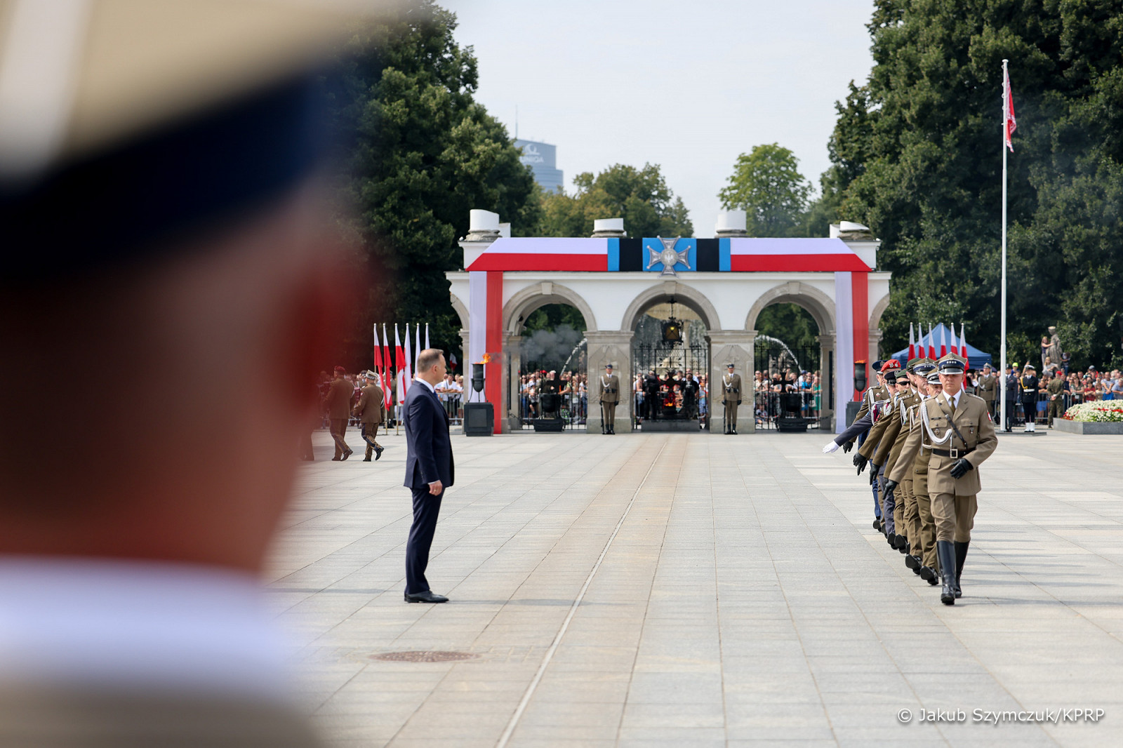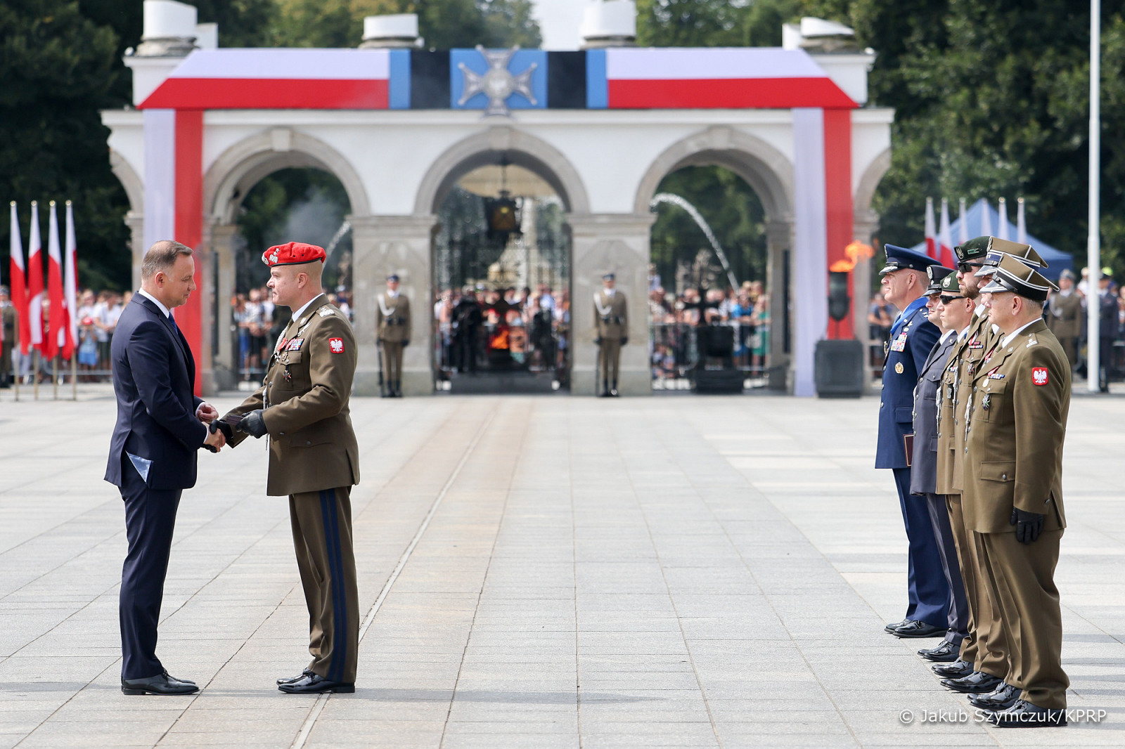 Prezydent RP, Zwierzchnik Sił Zbrojnych Andrzej Duda z Małżonką Agatą Kornhauser–Dudą wzięli dziś udział w uroczystej odprawie wart przed Grobem Nieznanego Żołnierza odbywającej się z okazji Święta Wojska Polskiego, obchodzonego na pamiątkę zwycięskiej Bitwy Warszawskiej w 1920 roku.
